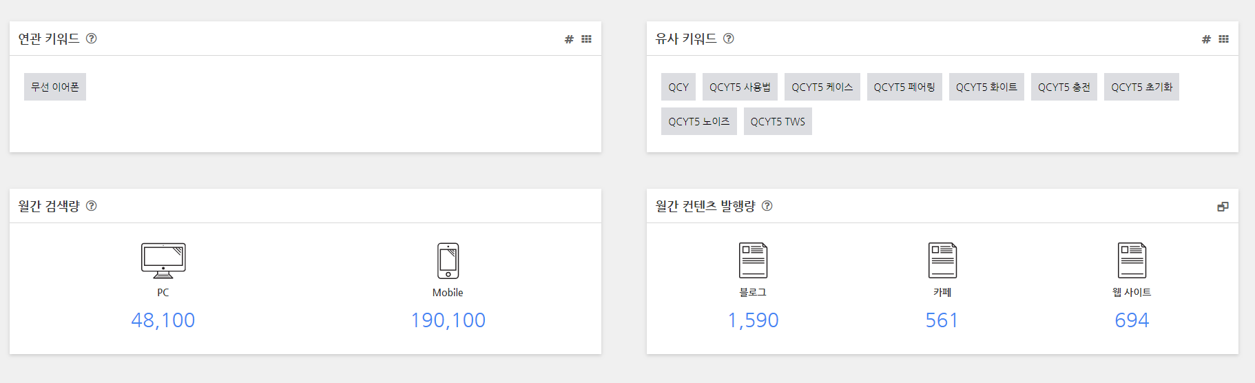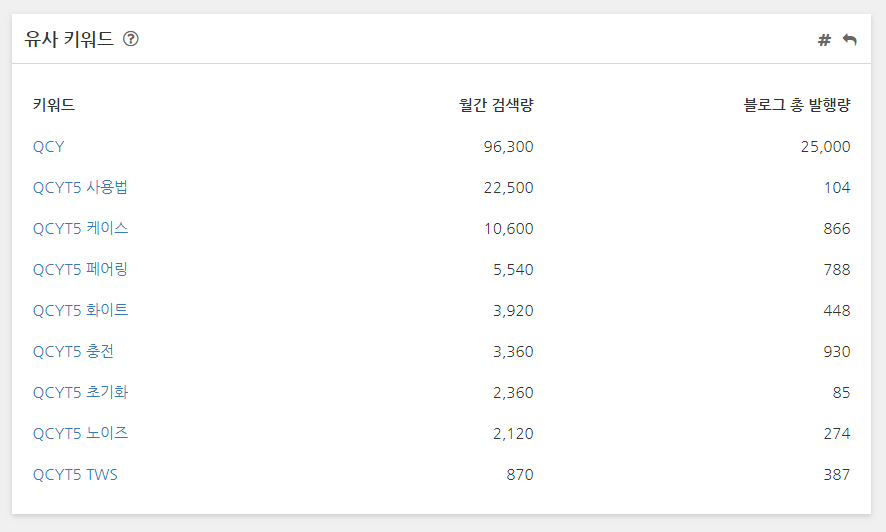 연관 키워드 , 유사 키워드, 월간 검색량, 월간 콘텐츠 발행량을 보여줍니다.