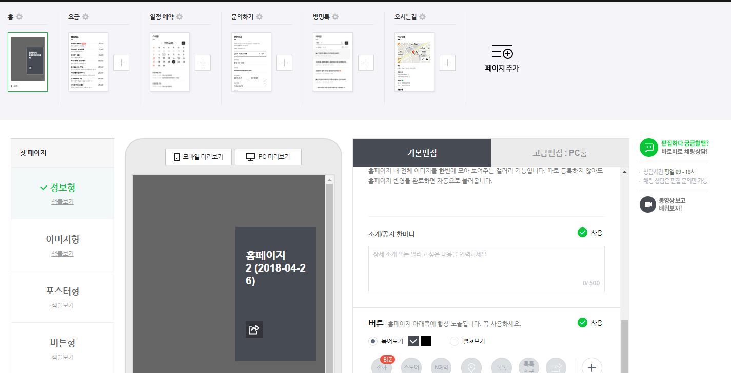 화면 미리 뷰가 되니 보면서 오른쪽 편집을 통해 페이지를 만들어 나가면 됩니다.