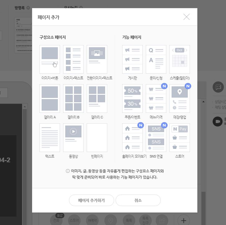 페이지 추가 버튼을 누르시면 다양 한 기능을 가지고 있는