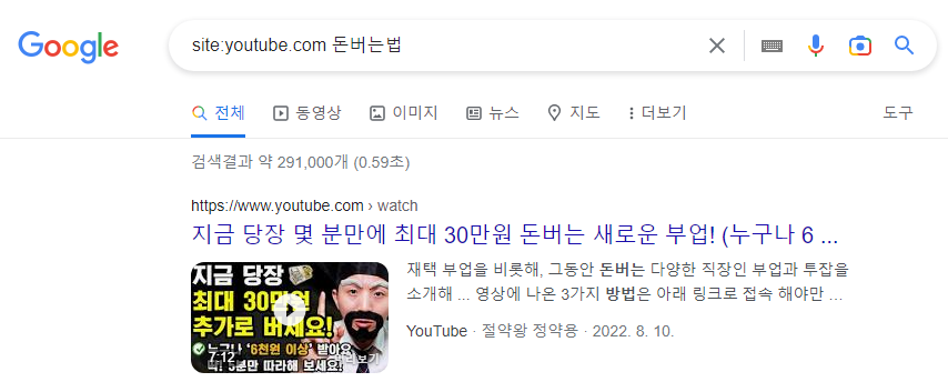 돈 버는 법 키워드 유튜브 검색 결과 약 291,000개