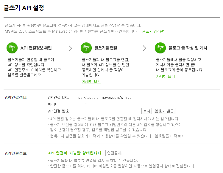 네이버 블로그 관리 > 메뉴·글·동영상 관리 > 글쓰기 API 설정